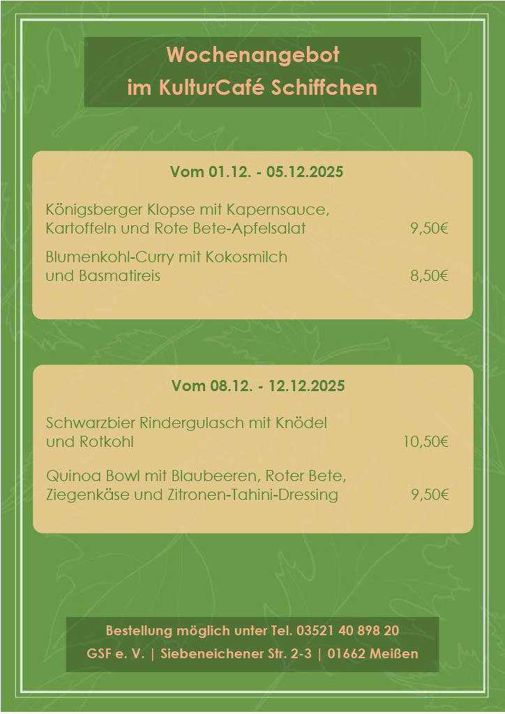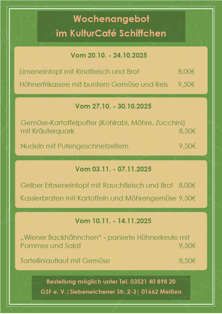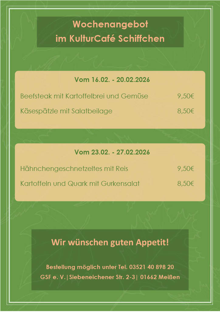 Mit unserem „KulturCafé Schiffchen“ wollen wir in Meißen auch für unsere Senioren ein Ort der Lebensfreude und Begegnung für den sozialen Austausch sein. Deswegen finden wöchentlich montags und donnerstags unsere Seniorennachmittage von 13 bis 16 Uhr statt. Wer sportlich aktiv sein will, findet mittwochvormittags von 11 bis 12 Uhr mit unserem Sportprogramm Gleichgesinnte.