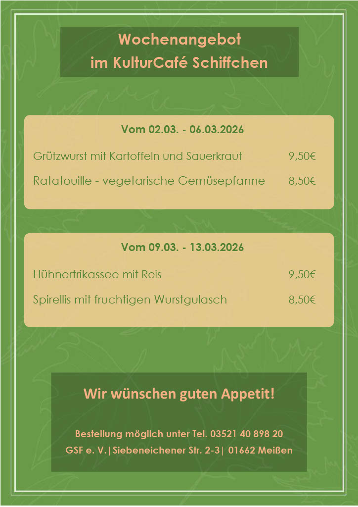 Mit unserem „KulturCafé Schiffchen“ unmittelbar an der B6, der Elbe und am Elberadweg gelegen, bieten wir unseren Gästen in Meißen einen sehr idyllischen Ort für Lebensfreude, Entspannung und vielfältigen Genuss. Entdecken Sie unser gastronomisches Angebot!