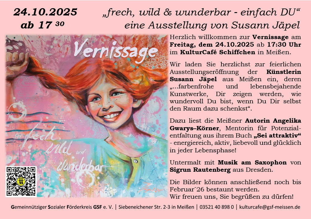 Gemeinsam eröffnen wir feierlich die Bilderausstellung der Künstlerin Susann Jäpel: Farbenfrohe und lebensbejahende Kunstwerke, die Dir zeigen, wie wundervoll Du bist, wenn Du Dir selbst den Raum dazu schenkst. Mit Lesung der Meißner Autorin Angelika Gwarys-Körner, Mentorin für Potenzialentfaltung aus ihrem Buch „Sei attraktiv“ - energiereich, aktiv, liebevoll und glücklich in jeder Lebensphase! Untermalt mit Musik am Saxophon von Sigrun Rautenberg aus Dresden | kostenfrei